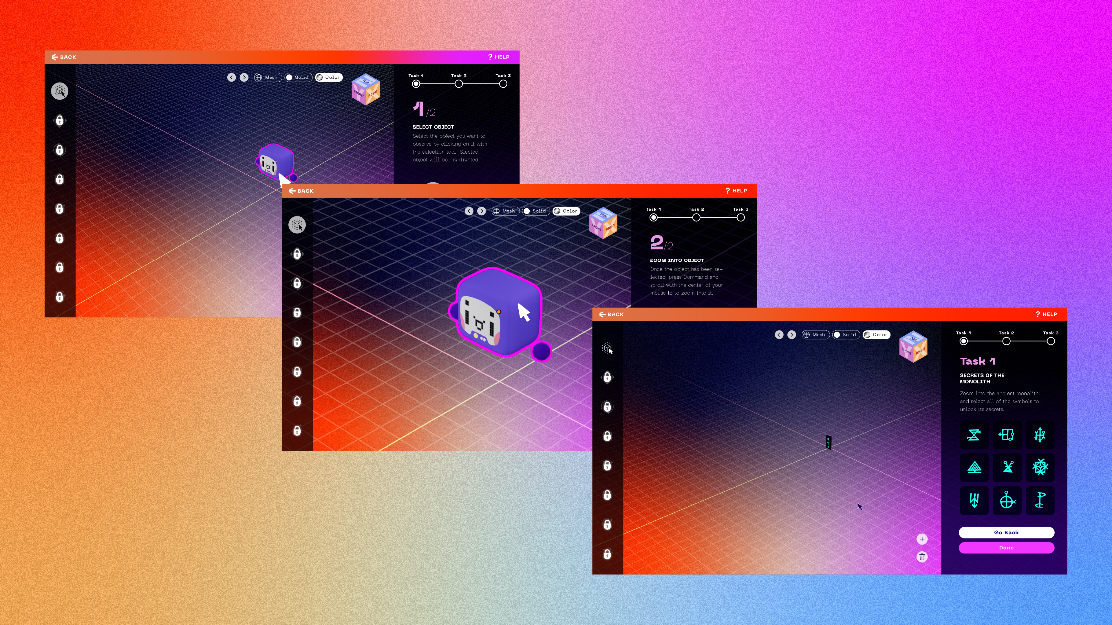 Once a player enters a room, they can interact with the various objects and characters within it. Some characters will provide the player with new missions they can complete with their newly acquired 3D modeling skills. As the player completes more quests, the story will continue to unfurl.