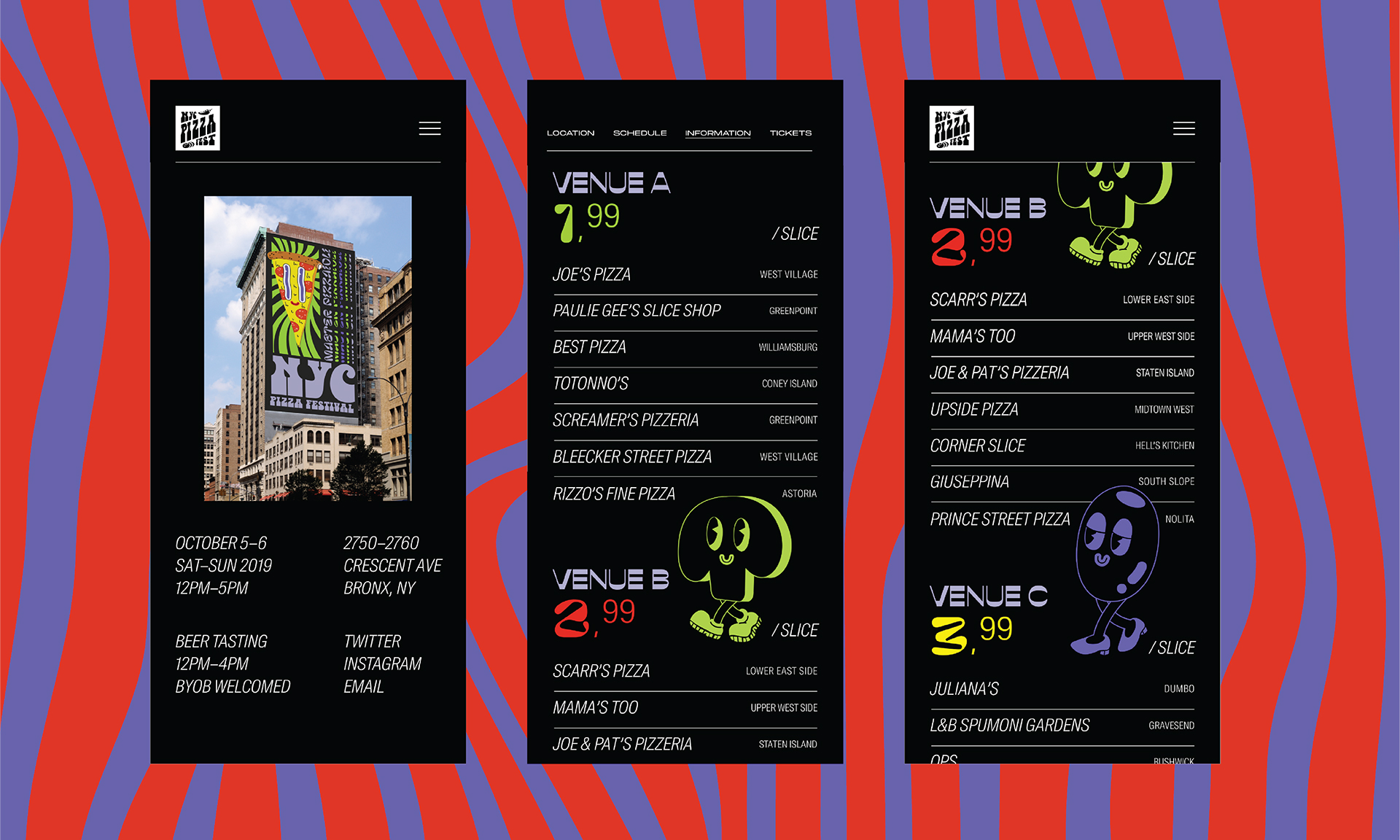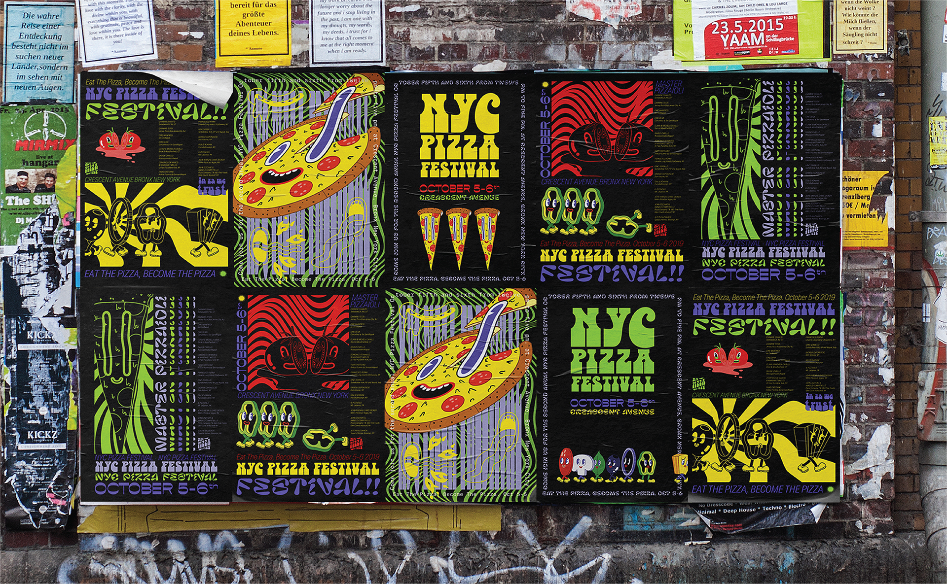 What happens when a pizza festival starts tripping mozzarella balls? Moving away from the pseudo-Italian aesthetic typically associated with pizza, the youth counterculture surrounding it is embraced instead. Taking cues from psychedelia, skater culture, and acid graphics, the type, color, pattern, Illustration, and voice are all carefully considered into a system of visual identity that screams “this is not your grandma’s pizza festival.” So, here’s to the Kidults, the Stoners, and the Skate Rats. Here’s to the other kind of pizza lovers.